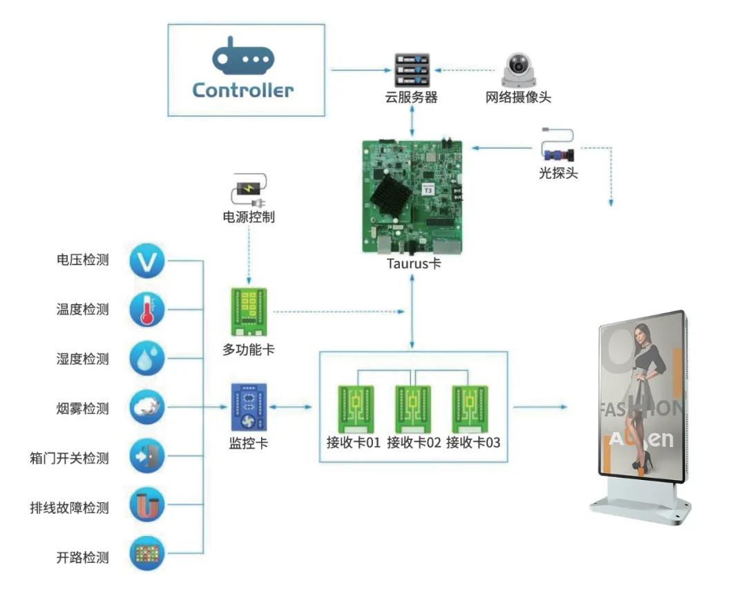用户能够监控屏体的发送卡、DVI、网络状态、温度、接收卡电压、监控卡的排线、湿度、烟雾、箱门开关、风扇转速、8 路电源电压、箱体温度。同时可以设置温度告警阈值,对屏体亮度进行调节。