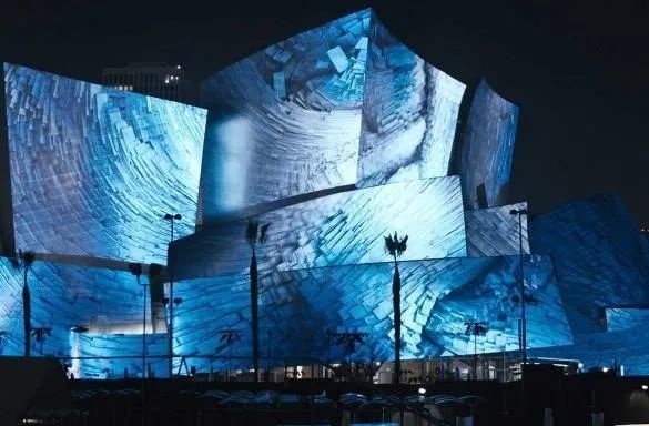 为了庆祝洛杉矶爱乐乐团的百年庆典,阿纳多尔选择将弗兰克·盖里设计的华特迪士尼音乐厅(WDCH)打造成一幅巨大的投幕,象征着乐团辉煌的百年历史和光明未来之间的桥梁。然而,由于音乐厅是由会反光的不锈钢材质的外立面建造的,投影影像必须足够明亮才能克服表面的反射现象。为了实现乐团的梦想,松下3芯片DLP®SOLID SHINE激光投影机PT-RZ31KU(中国型号PT-SRZ31KC)受命将音乐厅的外立面转化为动画、数据驱动的展现形式,为这座建筑地标注入了活力。正如阿纳多尔所说,只有具备“极其强大的投影”的能力,才能在一个充满光污染的城市中心建筑的反光表面上实现这一点。