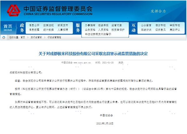 1月20日晚间,证监会官网发布的一则警示函,再次将拟科创板上市企业成都极米科技股份有限公司(以下简称“极米科技”)推上了舆论的风口浪尖。由于极米科技在IPO上市过程中,存在未按监管要求清理并披露相关对赌协议事项的情况,证监会决定对极米科技采取出具警示函的监督管理措施。同时收到警示函的还有其IPO主承销商中金公司及两名保代。