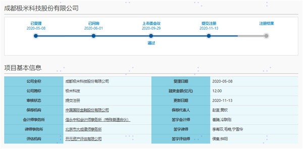 上交所官网显示,极米科技科创板IPO在2020年5月8日获得受理,之后在6月1日进入已问询状态,在当年9月29日公司上会获得通过。2020年11月13日,极米科技向证监会提交注册申请,但至今尚未注册生效。