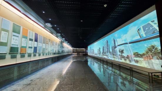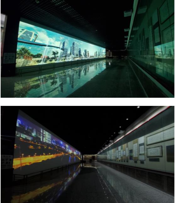 巨幕对面陈列着静态橱窗,将动态诗词与静态书画构成一个整体。为了能够观看清楚每部作品的细节,展厅天花板设有数量较多的筒灯。考虑到馆内强光将影响投影效果的这一因素,哈勃PA1004UL-W+ 液晶激光投影机1万流明的高亮度,对明亮度和超宽屏画面效果来说是一个更好的选择。