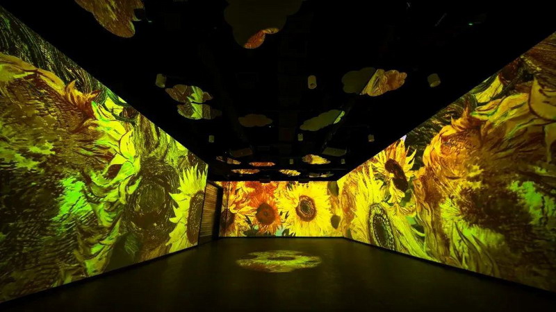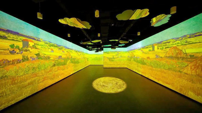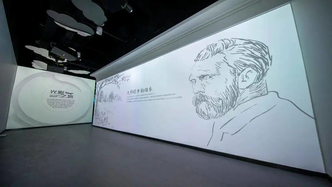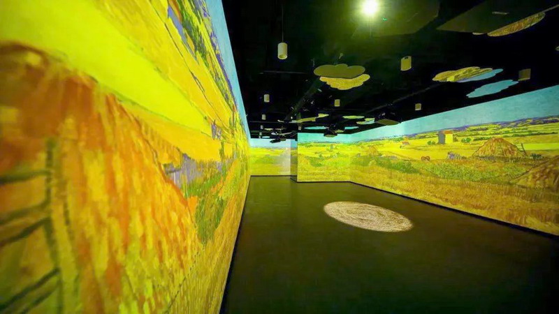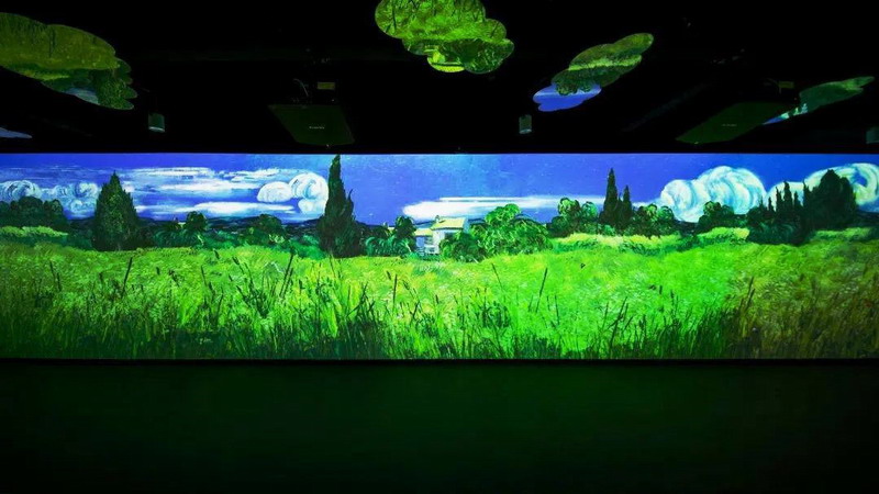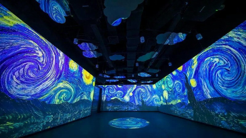 投影系统完成后的数字体验馆,可以瞬间带领游客进入“人在画中央”的模式。头顶星光闪耀,四周画彩流动,地面互动妙趣横生,玫瑰与睡莲,星空与浮冰,麦田与向日葵光影变幻,音乐宛转悠扬,整个展出充分调动了视、听、触等多种感官体验,让旅客在现实与虚拟交织的空间维度里,完成作品与观众情感的链接,与大师来一场美妙的邂逅。