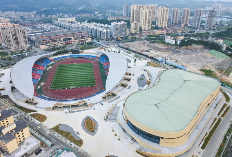 湄潭体育中心“一场两馆”项目于2016年2月正式开工建设,总投资约5.1亿元,包括体育场、体育馆和游泳馆,体育馆和游泳馆为合体建筑,内设足球场、400米跑道等设施,设有24543个座位。除承接遵义市运会在内的大型赛事之外,湄潭体育中心还将作为湄潭县重要的体育产业主题城市综合体,满足全民健身、体育交流、会展博览、商业演出、旅游观光等功能,打造湄潭县体育产业高地,全面带动湄潭及周边城市发展。