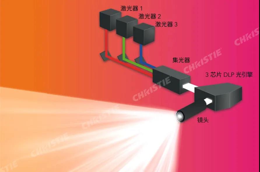 激光荧光投影使用蓝色激光二极管作为基本光源,生成红光和绿光。某些高端的投影机直接采用红光激光,弥补红光输出的不足。这类投影机覆盖 Rec.709 或 DCI-P3 色域,但其色彩官感仍不足以与 RGB 纯激光投影媲美。
