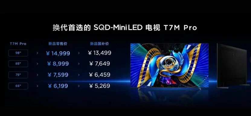 三款新品完整覆盖了五千至一万出头的主流价位段,把机皇同款的 100% BT.2020 全局高色域、万象分区控光、超级量子点等核心技术,毫无保留地下放。其中定位换代首选的 T7M Pro,65 英寸版本国补后仅5269 元,真正把 SQD-Mini LED 电视打入了5000 元主流价位,要知道,两年前这个价位只能买到最普通的 LED 电视。即便是定位轻旗舰的 Q9M Pro,75 英寸版本国补后也仅 8269 元,让万元内市场也能享受到旗舰级的画质体验。