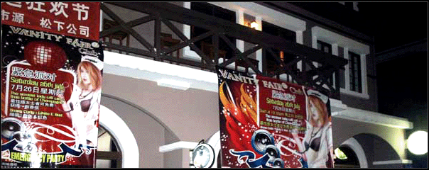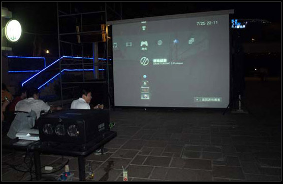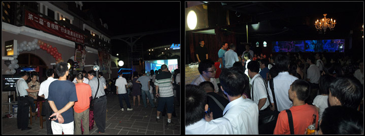 在室外,松下公司的10000流明投影机搭配全球首张OS 1080P投影幕以及最前沿的音响设备展现出一套顶级的视觉盛宴,投出一个200英寸4:3大屏幕图像,在3D类型的对决游戏的演示下,犹如亲临比武台,十分惊险刺激。另外,该设备也对室内的现场表演进行实况转播,使参加本次狂欢节的人们在室外也能看到酒吧内的现场图像。松下的10000流明投影机具有优秀的色彩还原效果,这使室外的人们同样感受到现场气氛,具有现场感,同时还吸引了酒吧街上的行人和其它酒吧的客人过来欣赏。