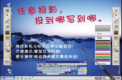 最值得一提的是,CP-74SP将投影与智能白板功能相结合,使得它具备投影机与互动电子白板的双重功能。工作时,可直接在投影机所投影出来的任意画面上做电脑功能点选、上网、书写、文字以及绘图,而且,它不需要再添加任何设备。此外,它还能配合无限指挥棒或手写操作,使用非常的便利。