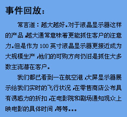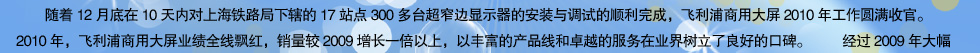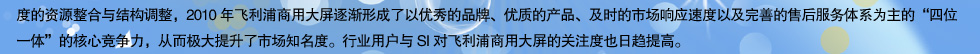2011年,飞利浦商用大屏将在原有的标准、增值和超窄边三个系列的产品线的基础上,再新增LED和电子白板两个系列的产品线,届时,飞利浦将拥有20款以上不同的型号,满足不同行业客户不同的应用需求。而在增值软件和系统集成业务的整合和规划方面, 2011年亦会有不同以往的重大举措,特别是在大型公共设施建设项目中,飞利浦商用大屏将会加大对液晶拼接领域的投入力度,在液晶的显示效果、综合成本、产品稳定性、安装与后期维护的便利性方面增创新优势,更好的服务国计民生。 飞利浦历来重视渠道发展的, 2010年与北京双旗良好的合作态势令双方都获益良多,2011年,飞利浦将大力推行渠道深耕计划,鼓励合作伙伴发展区域型和行业型二级代理商;同时飞利浦也有意愿与国内有实力的合作伙伴,展开更进一步的合作,包括给予一些合作伙伴以部分产品的全国总代理权限,实现互利双赢。 在谈到对明年目标的展望时,飞利浦商用大屏相关负责人表示,飞利浦总部对商用显示市场高度重视,已制订了一个全向全球的三年规划,而中国市场更是重中之重。2011年,飞利浦会更多的做好自己能决定的事,做好推广、做好渠道、做好产品及做好服务,力争实现业务较2010年增长2倍。 |