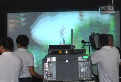 该被动式3D偏振系统在使用和操作上也非常简单,首先将其固定在数字放映及的镜头前,只需一根连接线与数字放映机相连,即可实现偏振式3D效果。在展会现场,魔影公司就有数字影院放映机在播放3D影片,参观者只需带上3D眼镜即可感受逼真的3D画面。
