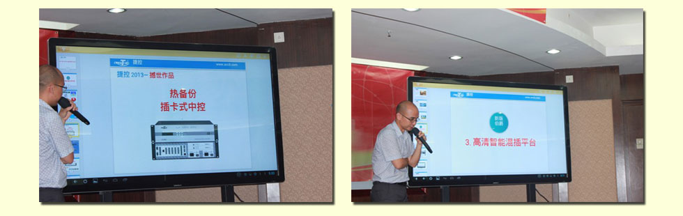 (3)双核热备份中控新品发布 热备份插卡式中控与智能混插平台的应用是此次新品发布会的重点之一。捷控企业从传统中控面临的危机谈起,对公司2013年最新推出的热备份插卡式中控进行了隆重的介绍。从产品的特征到应用进行了全面的分析和讲解,让大家对这款产品有了更深的认识。 |