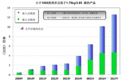 微投的未来市场相当令人期待,无论是在嵌入式于手机应用(安卓及苹果系统)、独立式、与笔记本相结合,还是超小型的口袋投影,耳机投影,3D投影,等都是相当吸引人的产品,PMA预测,全球微投2014年将起1700万台销售量,发展前景相当看好。