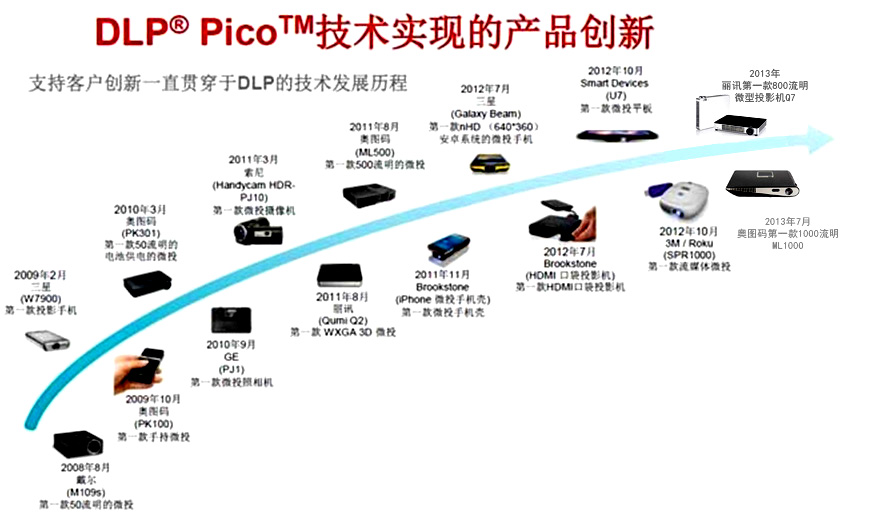 初期我们曾经开发跟手机般大小的為投影產品,后来因亮度问题跟连接性问题而改成直接置入在智能手机.笔记本(含PAD)跟DV等產品裡面,也由於LED灯泡亮度提升及分辨率提高