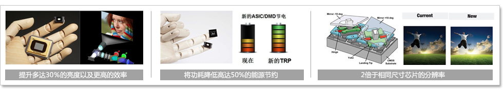 消费者对可提供大屏显示的小尺寸设备的需求越来越强烈。DLP Pico微投技术作为一种先进的显示技术,能很好地平衡功耗、尺寸、环保和大屏显示之间的矛盾,面向的就是人们对于随时随地分享大画面的需求。DLP技术一直都在坚持创新,努力为用户带来更小的尺寸,更高的亮度,更高质量的画面等。随着全新图像处理算法套件IntelliBright™和全新的突破性的像素架构Tilt & Roll Pixel(TRP)等更多DLP创新技术的推出,DLP微投产品将会进一步的降低功耗、提高亮度,尺寸也会进一步缩小,越来越多产品将会因此而具备大屏显示功能。DLP还将帮助提升未来各种微型投影产品——智能手机、平板电脑、数码影音播放器、移动配件、标牌、以及更多我们现今无法想象的各式应用,而智能显示也将在更多的领域和行业中得到更深入和广泛的发展和应用。在我们和合作伙伴的共同努力下,微投产品将会给用户带来更多惊喜,进一步满足大家对于“小设备,大画面”以及“随时随地分享”的需求。 |