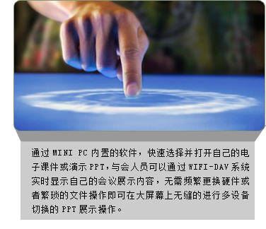直观上,84.4英寸的超大尺寸、分辨率达3840×2160(4K)高清配置在视觉上绝对让人惊艳。多点触控交互式,强大的软硬件组合毫无疑问足以满足广大用户各种需求。最值得关注的是,PROPAD(普乐派)采用世界首创WIFI-DAV无线视频传输系统,可实现多台机的屏幕显现在一台机上,双向便捷控制任意切换;同时,采用MINIPC控制整体方案 ,无需专用PC服务器,配置小巧轻便。“好用、易用”的用户感受很让人期待! |
