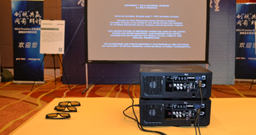 单通道被动立体投影显示系统由2台Proxima高亮工程投影机、偏振片及3D眼镜、视频融合器等组成。将两台投影机画面用镜头位移的方法重叠,再通过投影机自带的四角梯形校正功能把两个画面毫无差别地重合在一起,播放器输出的3D视频信号分两路,分别传输到两台叠加的Proxima高亮工程投影机上,实现特殊片源在120寸专用幕布的3D投影,为观众呈现出身临其境般的震撼画面。这种立体投影解决方案可运用于城市规划馆、科技馆、立体影院等大型场所。