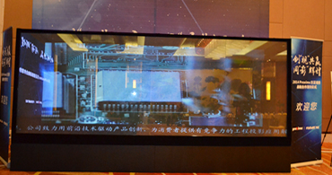 巨幕光波多点触控显示平台采用工作站式计算机系统,结合业界触控规格中的最高支持48点的可挠式光波多点互动技术,搭配表面以斜纹锯齿涂层技术的背投式太阳膜,作为显示屏,再通过多台Proxima无灯泡LED超短焦投影机配合硬件式高阶融合系统,做无缝拼接融合,达到大家现在看到的4米*1.5米的互动大画面。