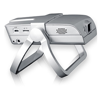 支架部分的设计和机身融为一体,在装上支架后并没有感觉到不自然。支架能够调整高度、方向、角度,满足用户在不同场合下使用。另外支架最大的用途就是移动电源功能,通过转接线能够让投影机实现200分钟的播放时间。