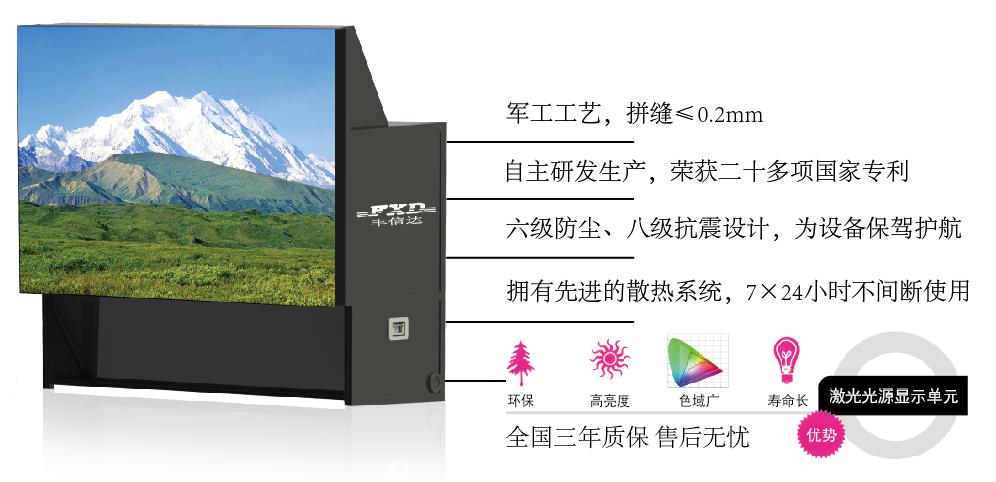 LPD系列显示单元颜色一致性好,亮度一致性也较现有DLP大屏幕高出很多,安装调试方便,激光光源具有即开即亮的特点,开机即可达到正常工作亮度。