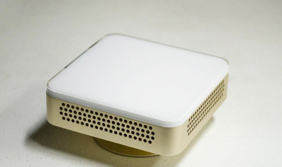 在看颜值的世界,微投所比拼的除了小巧还需比拼外观,毕竟是一种 “装逼神器”,需要拿得出手,带出去不能有失引领时尚潮人的身份。声物便携云投影D5s一开箱就惊艳到笔者,不含可拆卸的底座,整机尺寸为85*85*23mm,约巴掌大小,这在微投界还是很少见的,而且整体外观着色素雅,周身选用航空铝机身材质做硬件保护同时减轻机身重量,表面以氧化喷砂处理,土豪金机身质感十足,外壳亮白与土豪金双色,辅以pmma+ABS 双料注塑,尽显高贵时尚之身。 |