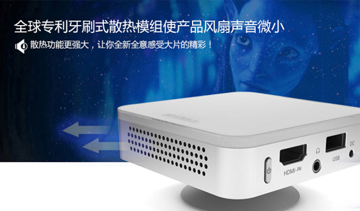 声物便携云投影D5s采用全球专利牙刷式散热模组,据笔者试用效果来看确实是名副其实,看完一部电影表面温度并没有想象的那么热。 |