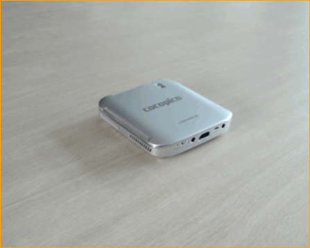 从外形来看,COCOPICON1绝对是微投界的顶级帅哥一枚。至小纤薄机身,纤小而不失稳重感。产品外观设计跟外包装设计一样也很极简主义。机器中间是COCOPICO的标识及左上角一个手动调焦手轮,整个机器呈现一个近似正方形,很小巧,一只手就可以拿住,纤小的机身非常符合这款产品主打的“如影随形”特点。