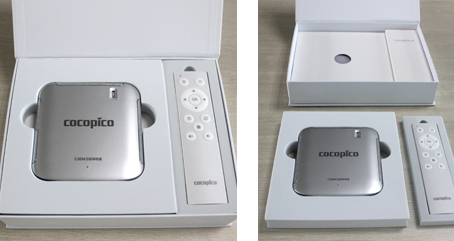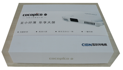 | COCOPICO N1盒子整体为白色,盒子外层由结实的捆绑式纸带捆绑,在没有任何防患下拿着盒子,盒盖都不会自己打开,里面的物件也不会散落出来,非常的保险。另外,光滑的触感和简约的设计给人感觉十分舒服。 | 怀着激动的心情像拆礼物一般拆开纸带,掀开盒盖,就看到COCOPICO N1和遥控器整齐的摆放在里面。接着往下看,所有的配件都被分隔开来包装在盒子里,人性化的设计从根源上防止各个配件相互碰撞,造成损伤。 |