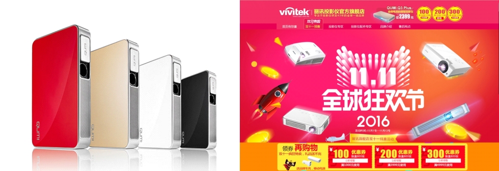 推荐理由:QUMI Q3 Plus具备500流明亮度,领先的LED光源寿命长达30000小时,彻底免除使用者更换灯泡的烦恼。在正常环境中可轻松打造100寸超大画面,支持DLP-LINK主动式3D技术,并同时引入蓝牙和MHL连接功能,可与智能手机、平板电脑、蓝牙音箱等设备轻松连接。此外,QUMI Q3 Plus突破性搭配8000毫安的嵌入式大容量电池,支持单机投影时间长达2小时,有效解决户外使用时间过短的缺憾。当然,QUMI系列一直所具备的USB直读、WIFI投影等优秀功能也在QUMI Q3 Plus身上得到了延续,使得这款产品在外观和性能上做到了“内外兼修”。钜惠活动:在本次Vivitek(丽讯)天猫旗舰店“11.11”的五重惊喜中,限时秒杀活动无疑是最刺激和最吸引人的,秒杀活动涉及Vivitek(丽讯)微投QUMI Q3 Plus、商教机型D552、D555WH、DS234四款机型,活动时间为11月11日0:00—1:59:59,在两个小时的时间内,QUMI Q3 Plus、D552、D555WH、DS234四款机型的秒杀价分别为1999元、1799元、2399元、1799元,相比于原价优惠都达到了数百元,数量有限,先“秒”先得,而且这样的冰点价格足可以秒杀很多高端电视和同类投影机。 购买链接:https://vivitek.tmall.com/ |