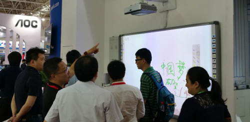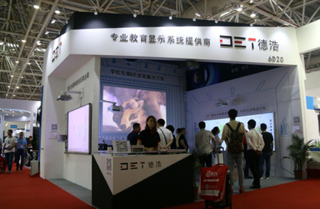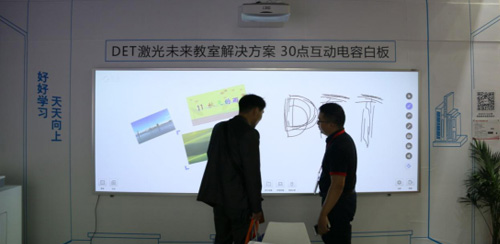 针对未来教室的解决方案,DET也在本次展会展示了激光互动未来课堂的崭新体验。它是由DET-T1与DET-Touch1搭建而成。DET-T1是专用于教学的超短焦、超宽屏激光教育投影机,亮度达3600流明,超短焦的特点能更大限度的节约教室空间,134寸的电容白板DET-Touch1可同时支持30点触控,搭配专业软件使用,可随意拖放、拉甩画面的各种文件,新颖的方式吸引了众多观众的眼球。